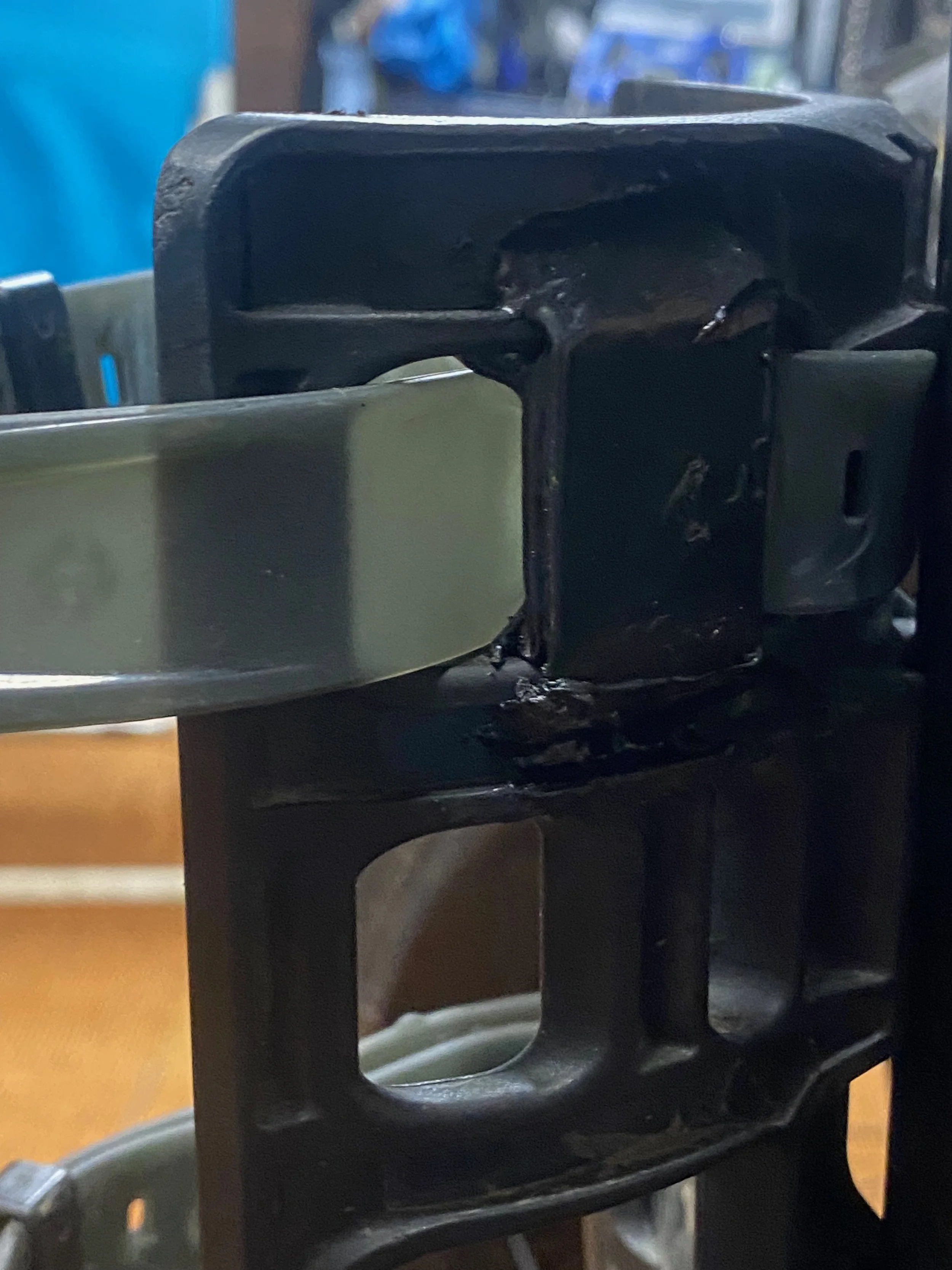 I drilled a 1/16” hole on each side of the crack and used a paper clip to wire the crack closed. Then I used moldable plastic to bond everything together.